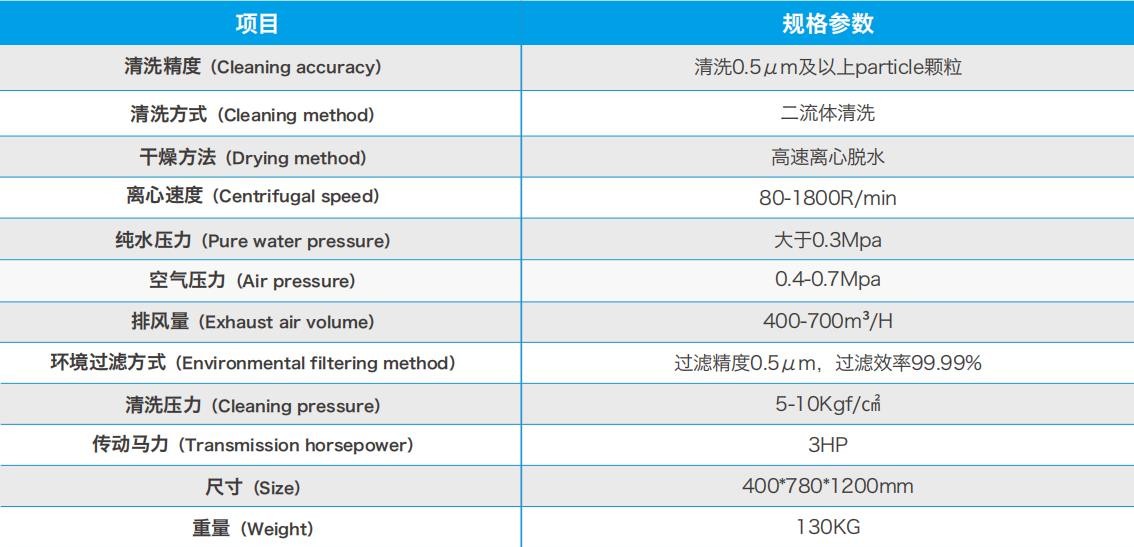 產品性能特點:二流體清洗方案、高速離心脫水、除靜電離子風系統、空氣過濾系統、 全彩觸摸屏、整體不銹鋼鏡面機身