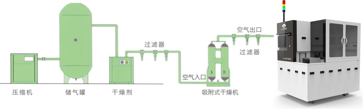 4、壓縮空氣:請使用大氣壓水汽結(jié)露點(diǎn)-15℃,油殘存不大于0.1ppm,過濾度0.01μm/99.5%以上的潔凈壓縮空氣,壓力0.5Mpa-0.6Mpa,流量450LPM。