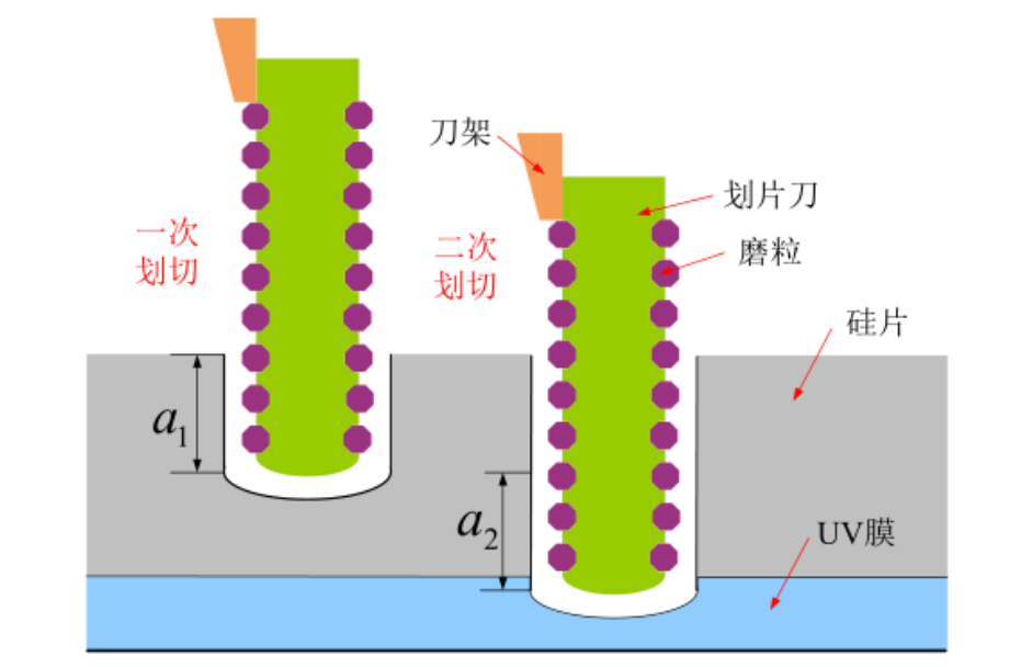單次切割,即一次完全切割硅片,切割深度到UV膜厚度1/2的位置,如下圖所示。該方法工藝過程簡單,適合超薄材料切割,但切割過程刀具磨損嚴重,切割道邊緣易產生崩邊和毛刺,工件因受磨削力的影響,材料表面及亞表面易產生裂紋等缺陷。