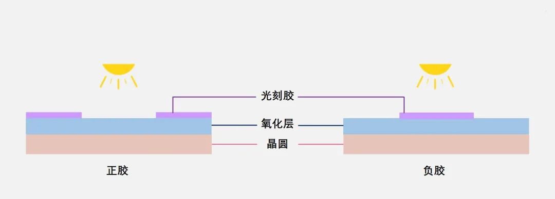 根據(jù)光(紫外線)反應(yīng)性的區(qū)別,光刻膠可分為兩種:正膠和負(fù)膠,前者在受光后會分解并消失,從而留下未受光區(qū)域的圖形,而后者在受光后會聚合并讓受光部分的圖形顯現(xiàn)出來。