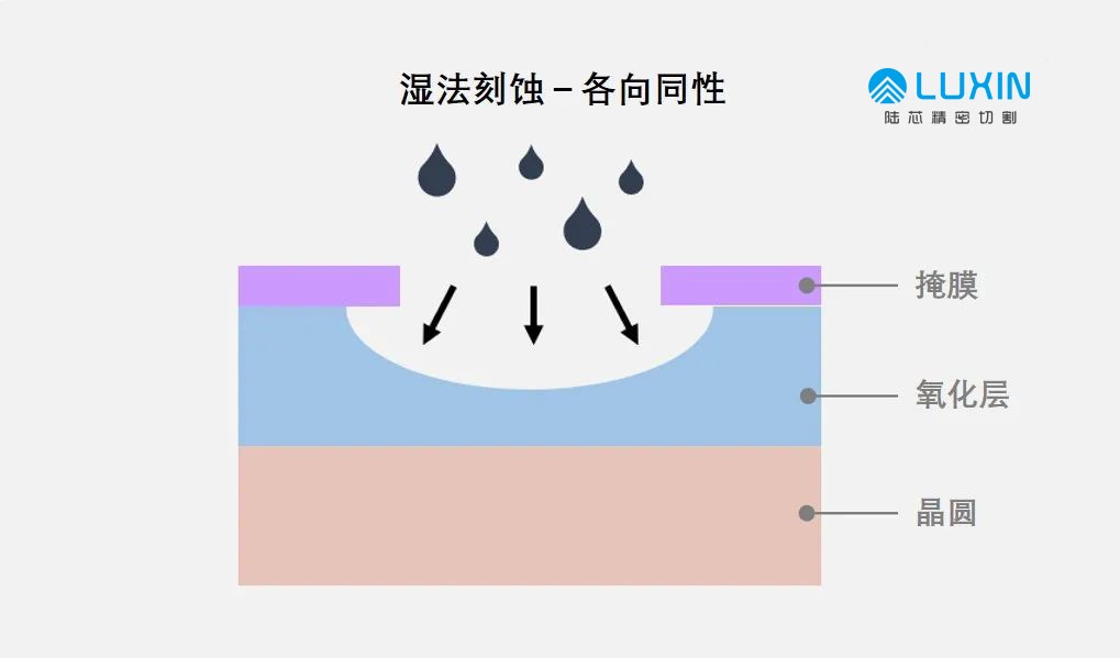 使用化學(xué)溶液去除氧化膜的濕法刻蝕具有成本低、刻蝕速度快和生產(chǎn)率高的優(yōu)勢。然而,濕法刻蝕具有各向同性的特點(diǎn),及其速度在任何方向上都是相同的。這會導(dǎo)致掩膜(或敏感膜)與刻蝕后的氧化膜不能完全對齊,因此很難處理非常精細(xì)的電路圖。