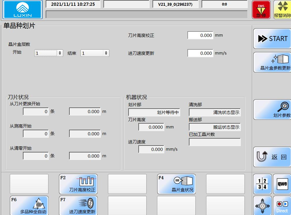 高度校正:在劃片參數里刀片高度的設定下,輸入數值可抬高或降低刀片高度。輸入修改的高度后,點擊F2刀片高度校正。