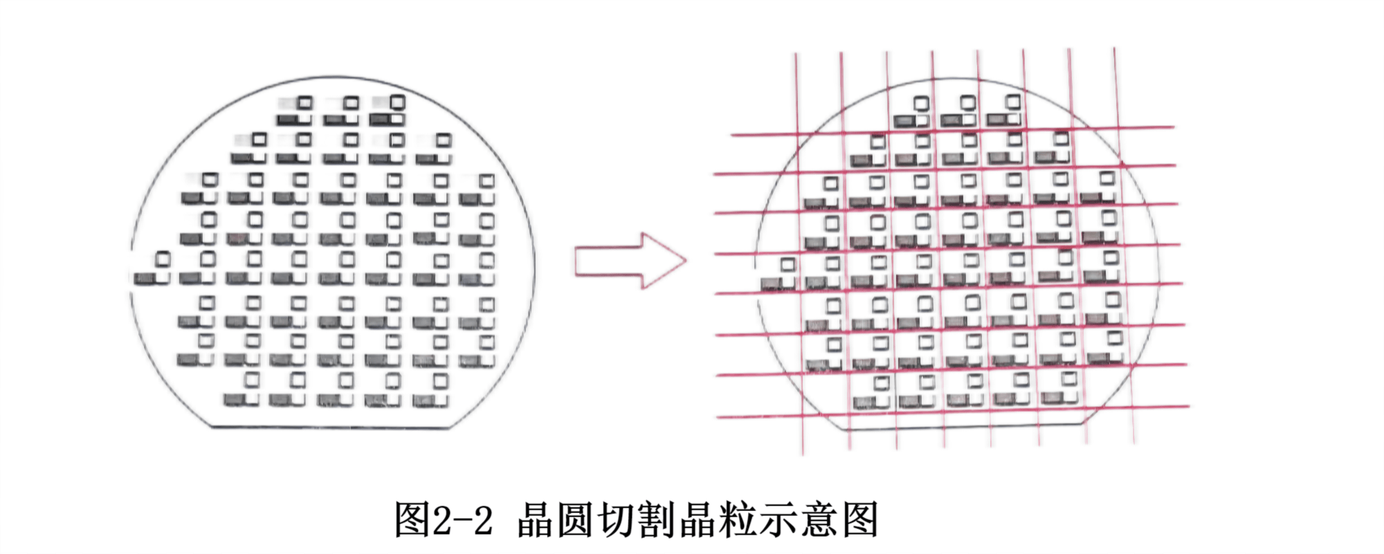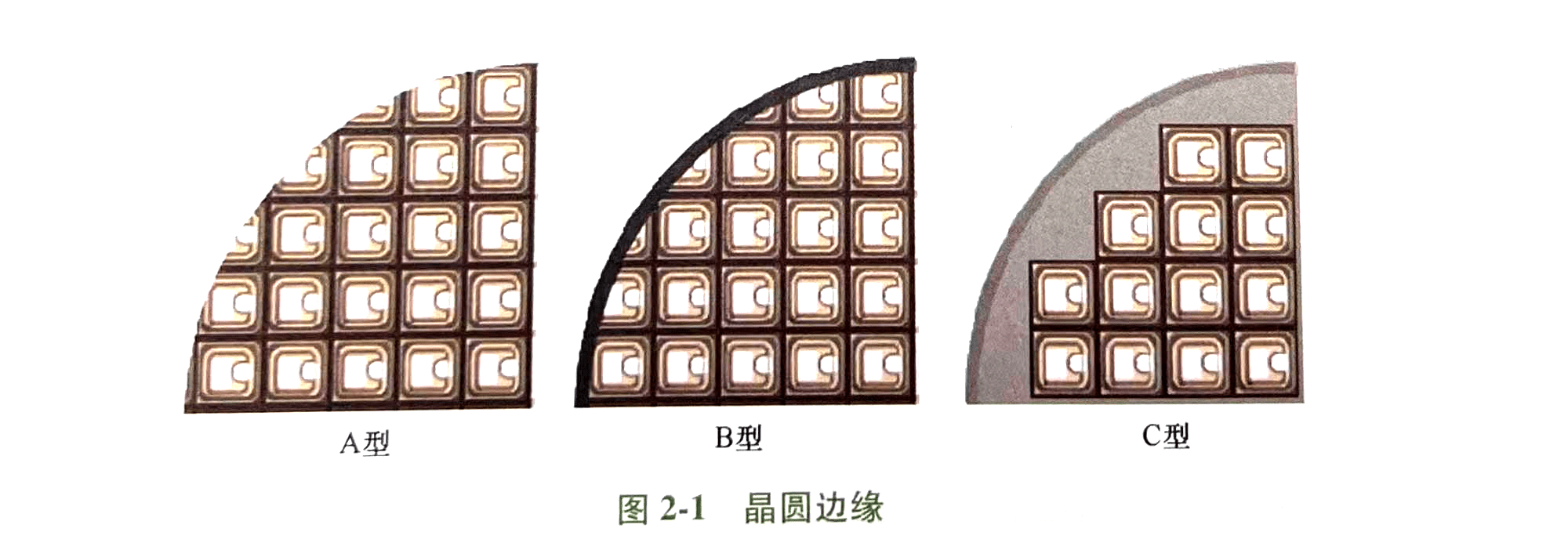 在半導體制造過程中,晶圓邊緣某一區域的芯片圖形工藝不完整,如圖所示 2-1 所示。考慮到邊緣區域圖形不完整,在制作掩模板時將其去除。每個圖形都是工藝和功能齊全的晶粒,便于良率統計、晶粒分揀和盲密封。硅晶柱尺寸越大,可切割的晶圓面積越大,功能齊全的有效芯片晶粒數量越多。因此,芯片制造工藝越先進,晶圓尺寸越大,每個電路芯片的成本越薄,半導體的生產成本就越低。