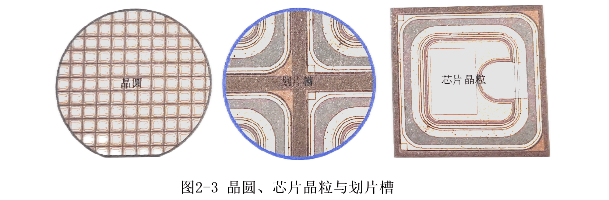幾到幾十萬個電路芯片被一個晶圓重復刻蝕。在晶圓上,電路芯片單元通過一定區域相互隔離,稱為芯片晶粒隔離區,如圖2-2、圖2-3所示。在使用芯片晶粒之前,需要通過有效的手段將其分割并單獨去除。此時,有必要將晶圓劃分為單獨的芯片晶粒,然后對芯片晶粒進行鏡檢、焊接、鍵合、密封等工序,以便包裝成品集成電路,可以實現各種功能,不易被環境損壞。