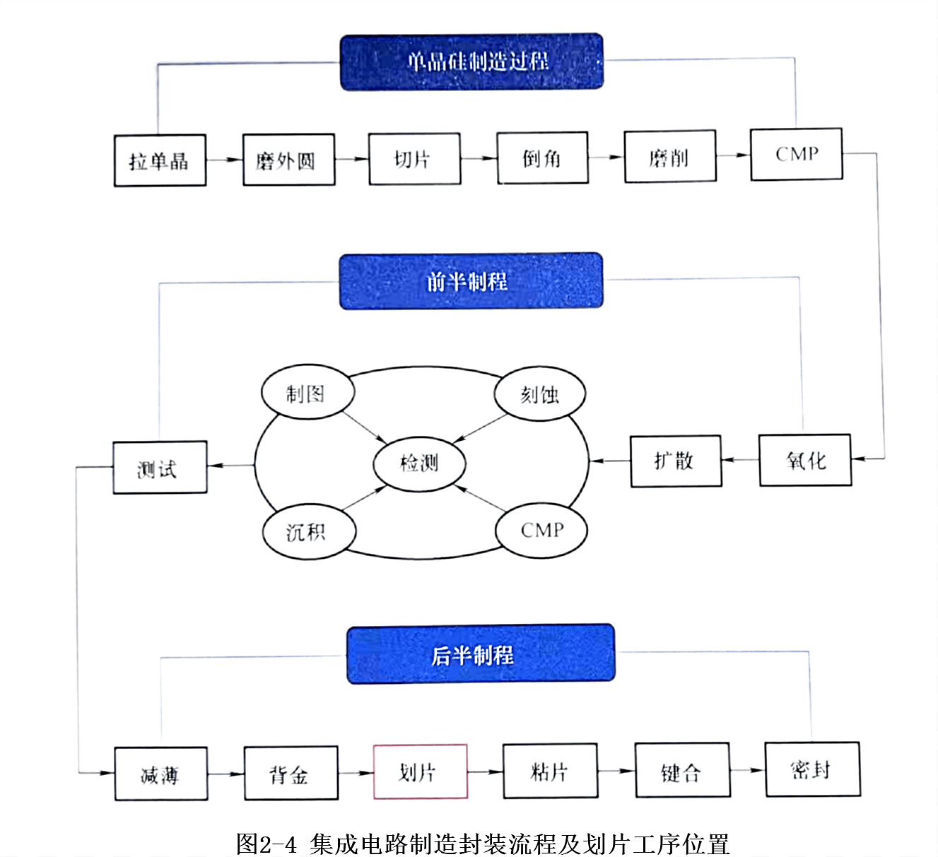 圖2-4顯示了集成電路制造的包裝過程和分割過程的位置。晶圓片是電子包裝過程中的第一道工序,主要通過研磨、燃燒等方式進行分割。在此期間,隨著晶圓的固定和清洗,以確保芯片不被分割過程中產生的污垢污染,并保持晶粒的清潔度。同時,還要確保芯片電路功能在分割過程中的完整性和可靠性。