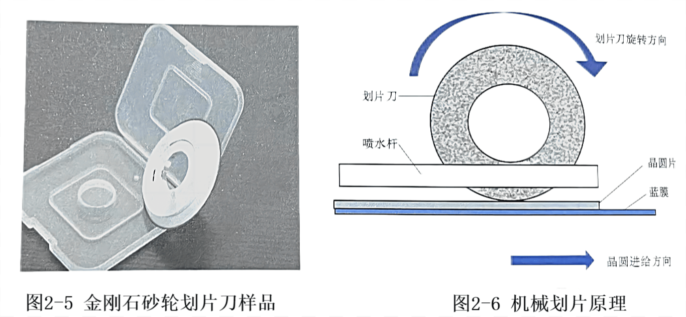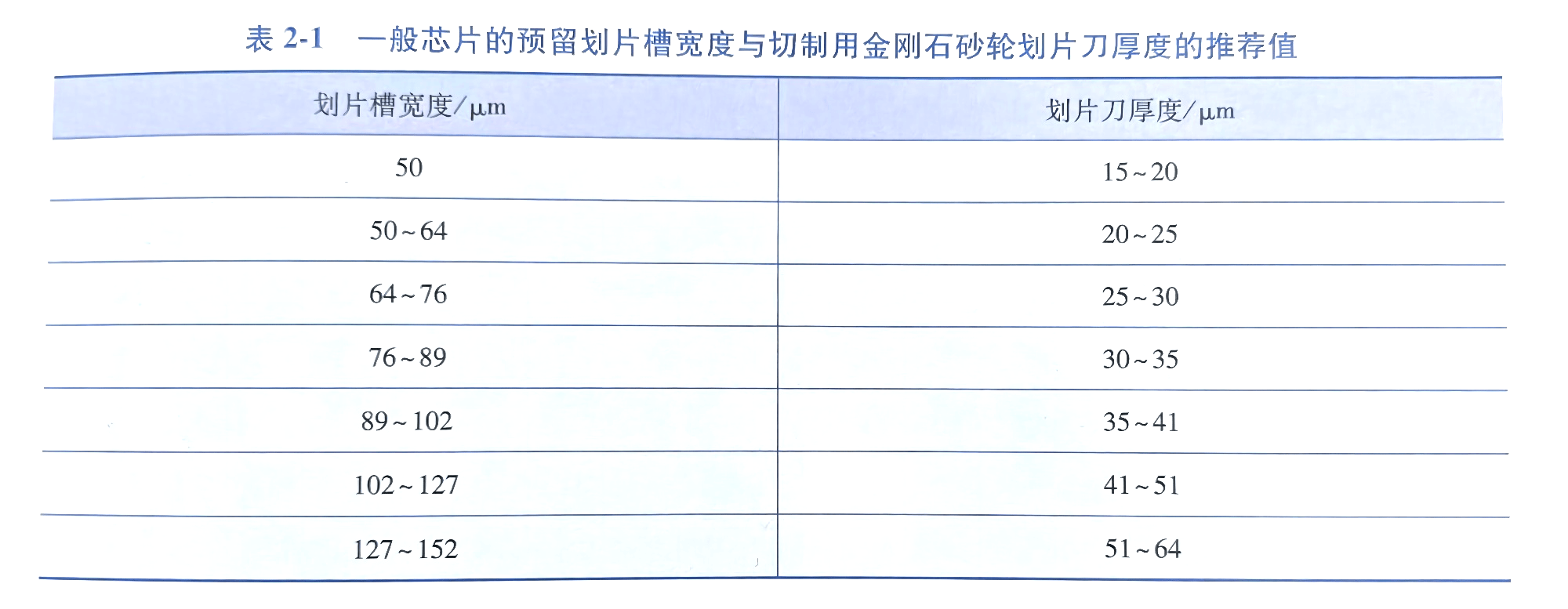 最早的晶圓切割方法是物理切割,通過橫向、縱向切割運動,將晶圓分成方形芯片晶粒。目前,用金剛石砂輪切片刀(見圖2-5)晶圓切割方法仍占據主流地位。機械劃片的力直接作用于晶圓表面,會對晶體內部造成應力損傷,容易造成芯片崩邊和晶圓損傷。尤其是對厚度 100um 在下面的晶圓劃片中,很容易導致晶圓破碎。機械切片速唐一般為8~10mm/s,分區速度慢,要求分區槽寬度大于 30um,高可靠電路的劃片槽寬度應更大,甚至達到 50~60um,確保芯片劃片后的完整性和可靠性。一般芯片的預留槽寬度和金剛石砂輪切割刀的推薦值如表所示 2-1 所示。機械劃片原理如圖所示 2-6所示。
