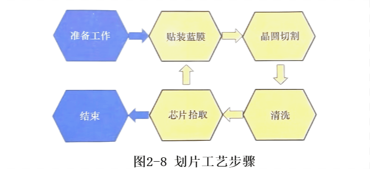 劃片工藝開始前,首先要做好必要的準備;之后,將待切割的晶片粘貼在藍膜上,將藍膜框架放入劃片機,開始劃片過程,實時清除劃片產生的硅渣和污垢;最后,撿起并保存分割芯片。具體步驟如圖所示 2-8 所示。