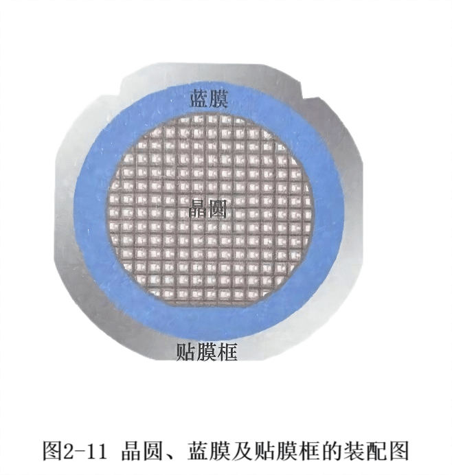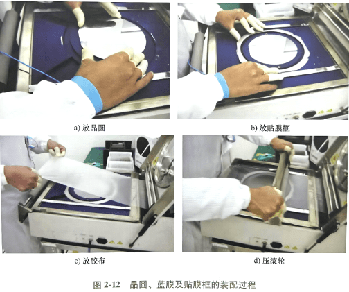 圖2-11 晶圓、藍膜和貼膜框的膜框的裝配圖 2-12給出了晶圓、藍膜和貼膜框的組裝過程。首先,取出一塊晶圓,正面朝下,背面朝上,放在貼膜機工作盤上,打開真空開關,吸收晶圓。然后將貼膜框放在貼膜機工作臺上,使其中心與晶圓中心對齊,并將側定位框移動到貼膜框外側,將其左右限位。最后,拉出足夠長的藍膜,拉緊,貼在貼膜機后部,覆蓋整個貼膜框區域,用滾筒壓過藍膜,將晶圓、藍膜和框架組裝在一起。