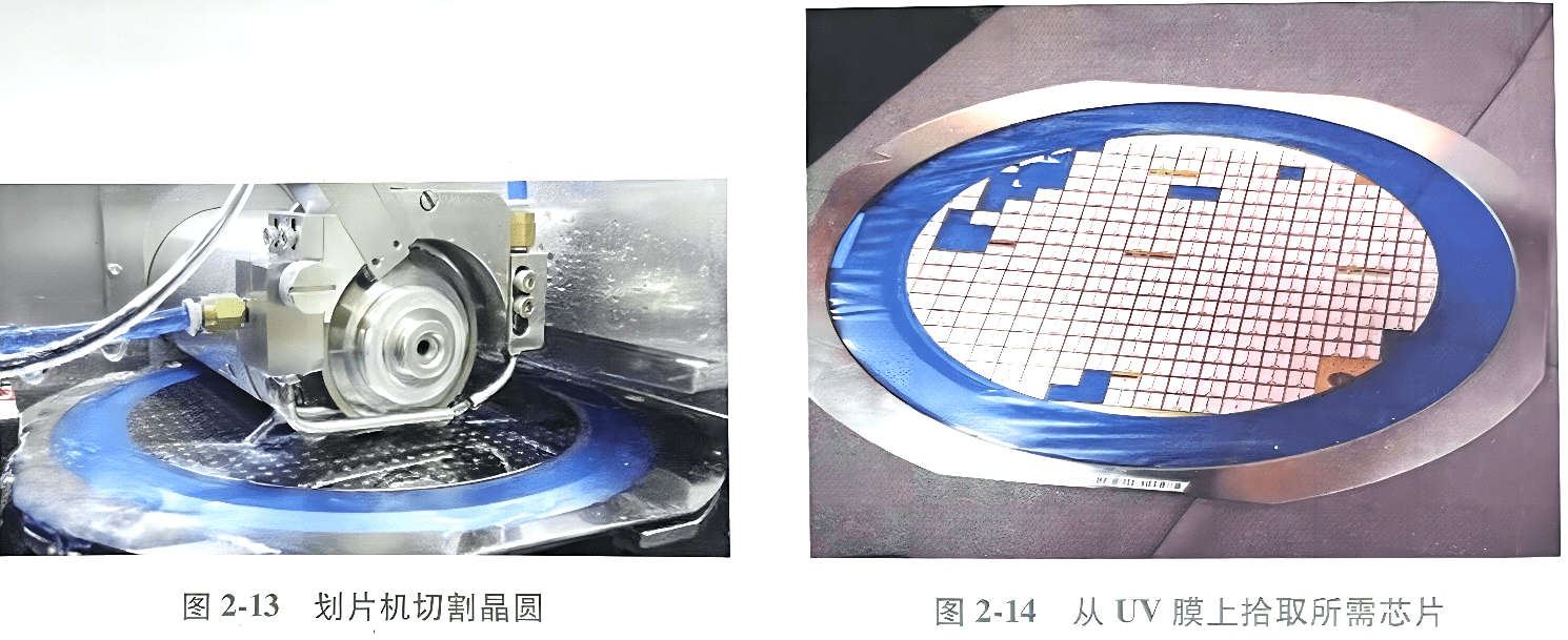 晶圓按芯片大小分成單晶粒,用于隨后的芯片貼裝、引線鍵合等工序。雖然機械分區存在許多可靠性和成本問題,如晶圓機械損壞嚴重、晶圓分區線寬大、分區速度慢、冷卻水切割、刀具更換維護成本高等,但機械切割仍是主要的分區方法。通過調整切片工藝參數,選擇最佳刀具類型,采用多次切片等方法,解決機械切片芯片崩邊、分層、硅渣污染等問題。切割晶圓如圖所示 2-13所示。