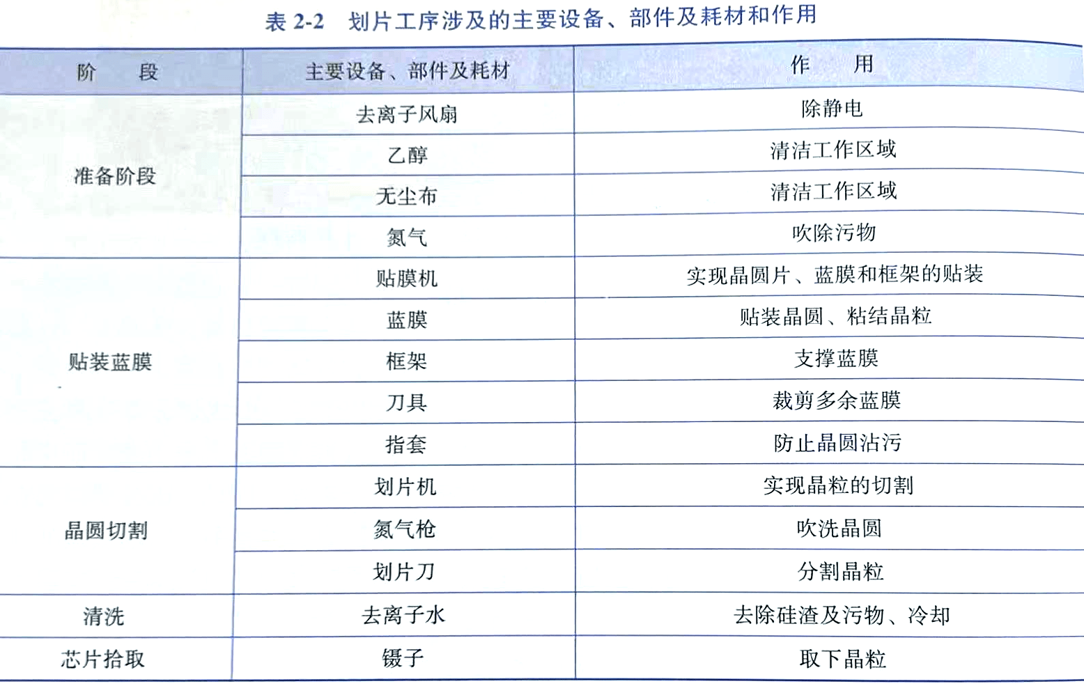 表 2-2 主要設備、部件、耗材及劃片過程中涉及的功能。